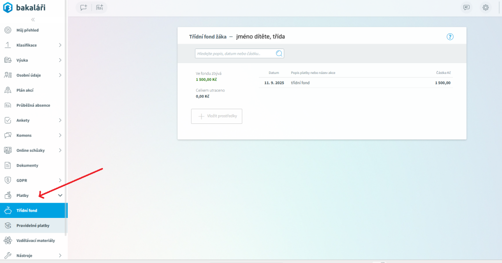 Od 10. 9. 2025 jsou povoleny vklady do třídních fondů. Platby za žáky, které byly přijaty do tohoto data, budou postupně převáděny i do systému Bakaláři.